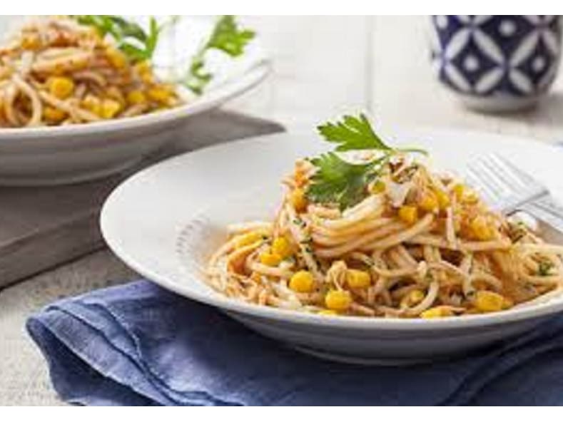 Macarrão Spaghetti, Molho Branco, Frango, Ervilha, Milho Verde E Queijo